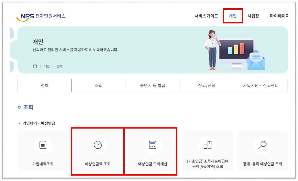 ◎ 국민연금공단 홈페이지 → 간편인증 로그인 → 개인 → 예상연금 조회에서 조회 가능합니다.