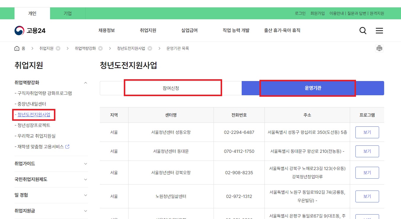 고용24 → 취업지원 → 취업역량강화 → 청년도전지원사업 → 로그인 후 신청