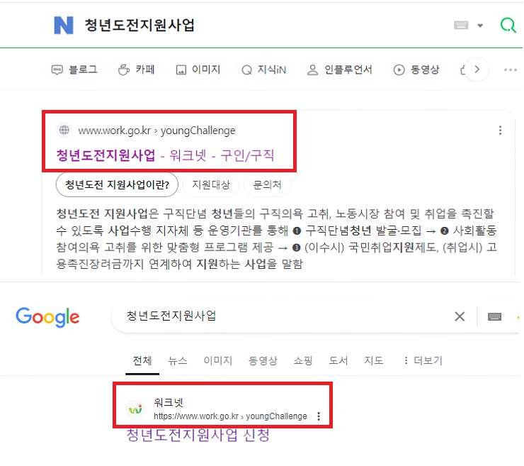 ▶ 네이버나, 구글에서 청년도전지원사업으로 검색하면 아래와 같이 신청 사이트로 연결 가능합니다.