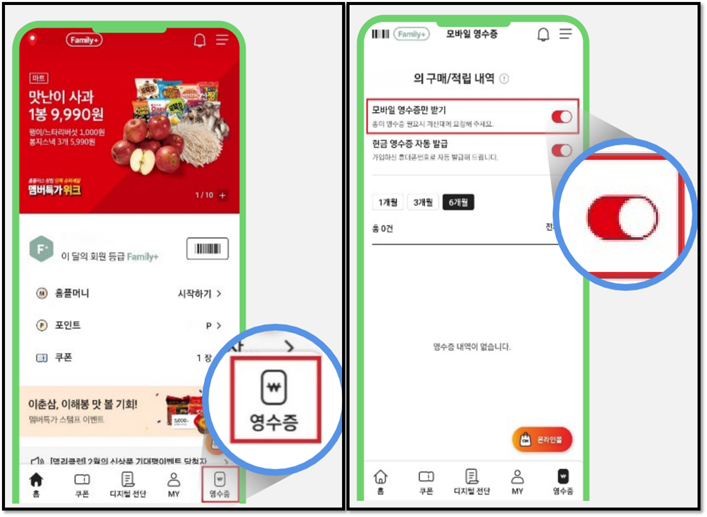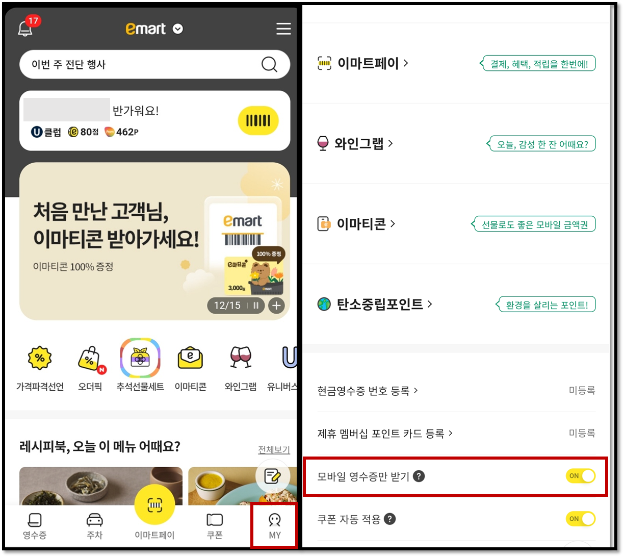 ▶ 이마트앱 실행 → 우측 하단 [MY] 선택 → 모바일영수증만 받기 활성화