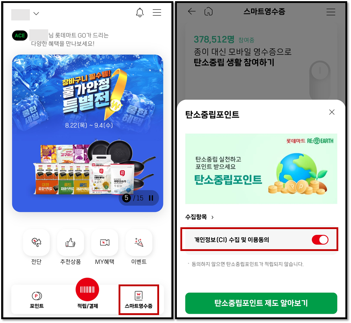 → 개인정보 수집이용 동의 → 스마트영수증 ON