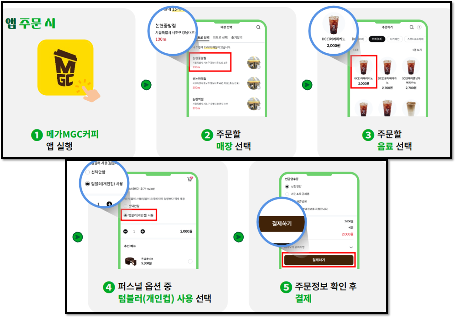 ▶ 메가MGC커피 앱 실행 → 매장 선택 후 음료 주문 → 텀블러(개인컵) 사용 선택