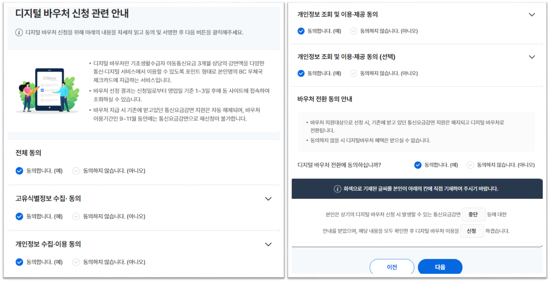 → 기존 통신요금감면이 중단되고 새로 디지털 바우처 이용권으로 전환하는 것에 동의하고