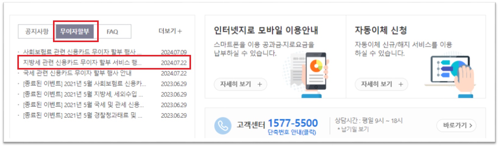 ▶ 지로 홈페이지 접속 → 인터넷 지로 선택 → 메인화면 왼쪽 하단 무이자할부에 행사 중인 리스트 확인
