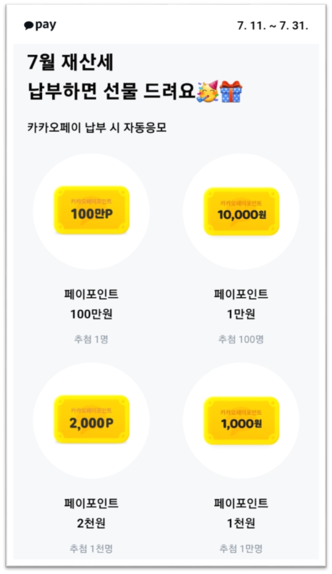 카카오페이로 재산세 납부 시 추첨을 통해 포인트를 제공해 주는 이벤트를 하고 있습니다.