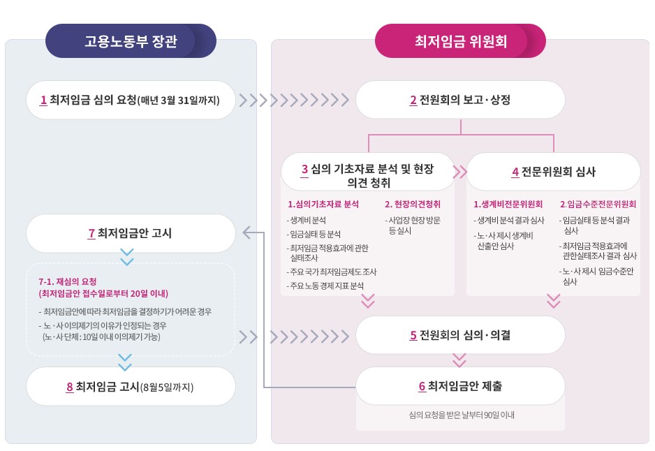 매년 최저임금은 아래의 과정을 거쳐 결정하게 됩니다.
