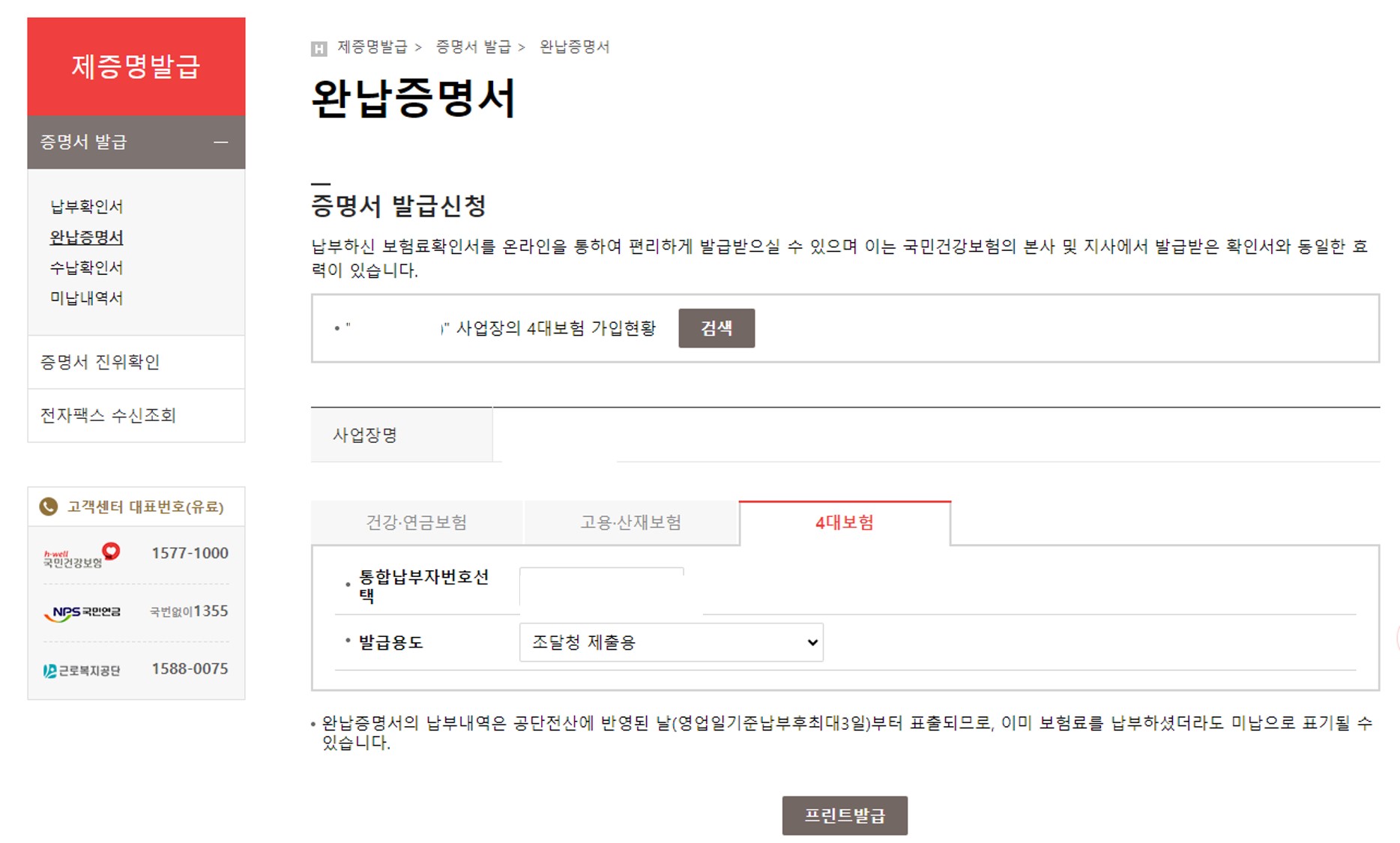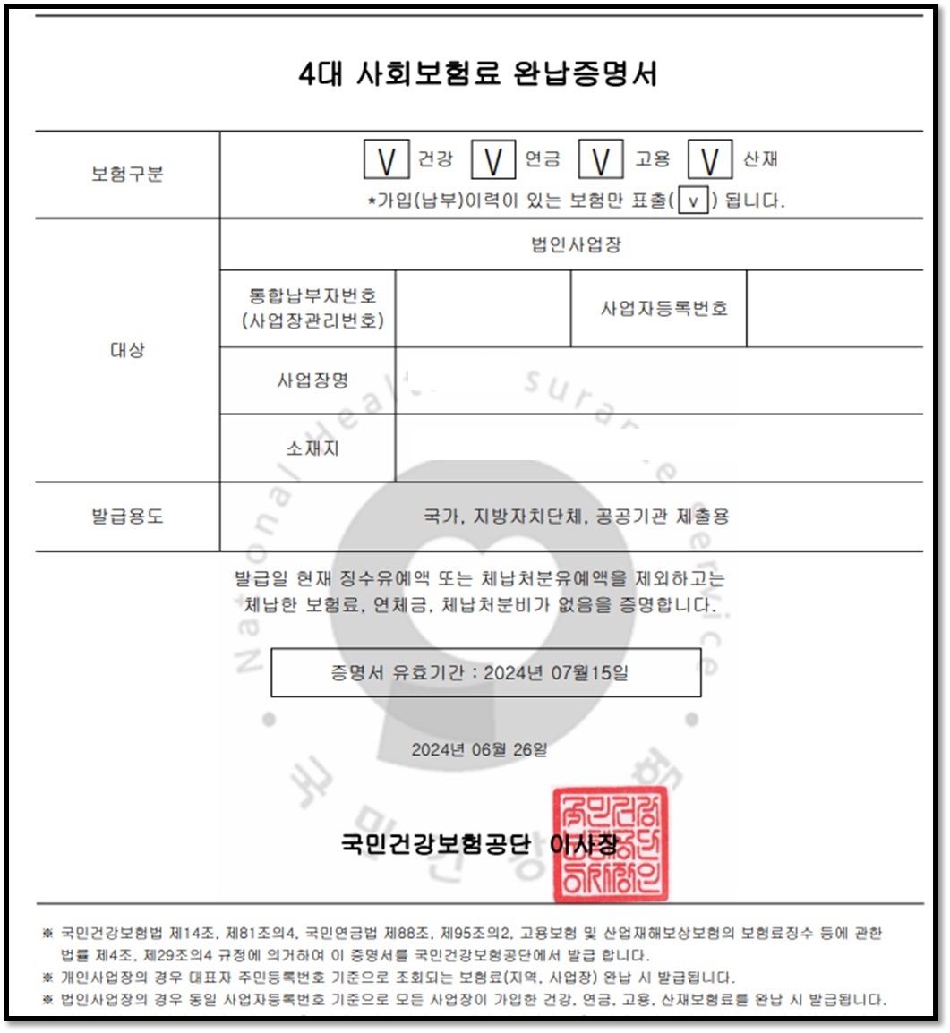 ▶ 4대보험 보험료, 연체금, 체납처분비에 대해서 완납 여부를 확인할 수 있는 증명서입니다.