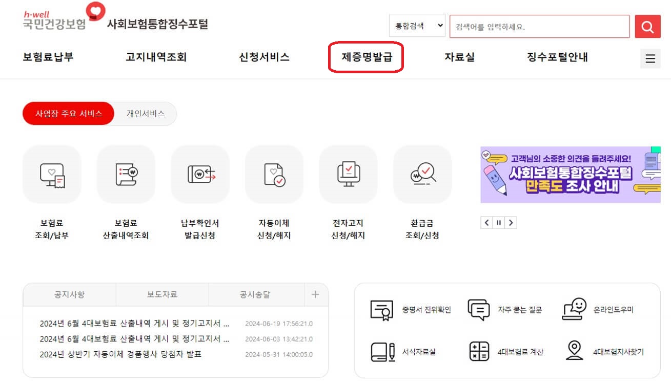 ② 자추찾는 서비스 → 사업장 → 4대보험완납증명서 클릭 → 사회보험통합징수포털로 연결 → 제증명발급 선택