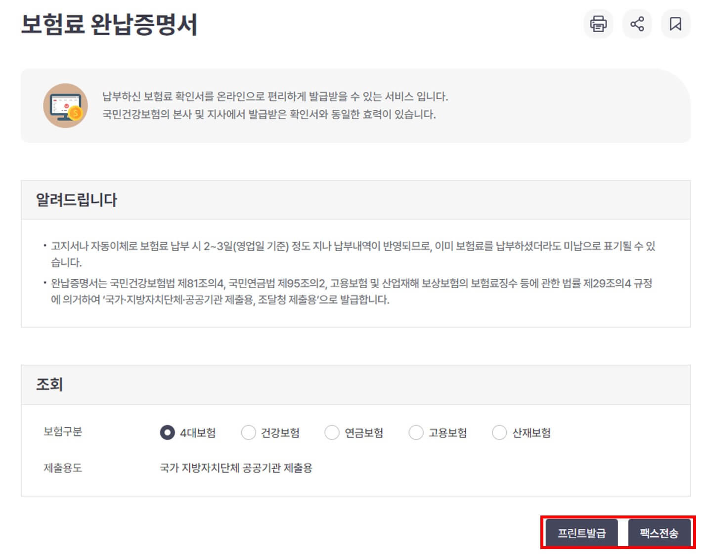 ③ 아래 화면에서 프린트 발급 선택 시 PDF 파일로, 팩스 전송 선택 후 팩스번호 입력 하시면 됩니다.